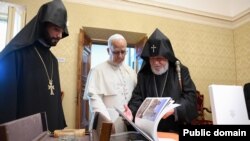 Մայր Աթոռի տարածած լուսանկարներում ժպտում են Հռոմի պապն ու Ամենայն Հայոց կաթողիկոսը, և միայն մի նկարում են երկուսն էլ մտածկոտ։ Այստեղ վեհափառը նվերներ է փոխանցում Հռոմի պապին՝ Արցախի հուշարձանների ալբոմը: